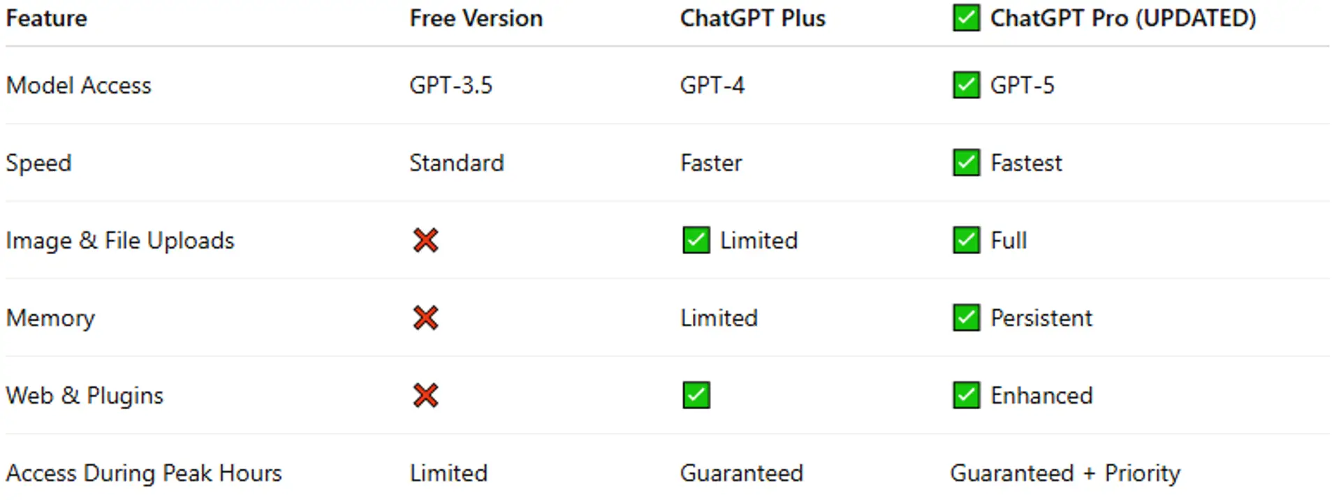 💡 Recommendation: Start with the free version to explore features. Upgrade later if you need advanced tools like image understanding, file analysis, or custom memory (available in GPT-5).