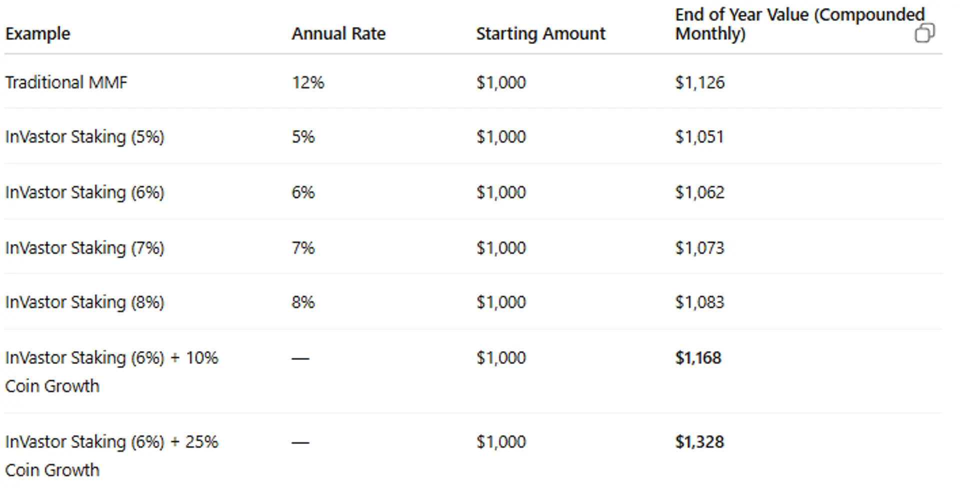 Here’s an example of what staking can look like with monthly compounding compared to a traditional money market fund (MMF) yield of about 12% per year.