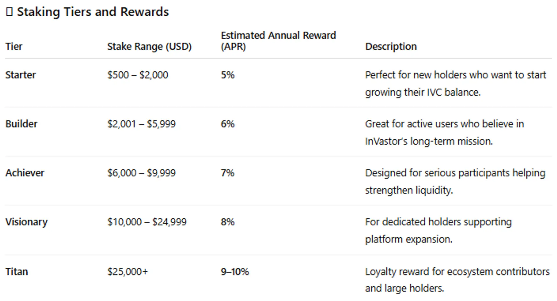 InVastor staking rewards are not guaranteed returns or investments. They represent ecosystem-based incentives that depend on participation, activity, and network growth.